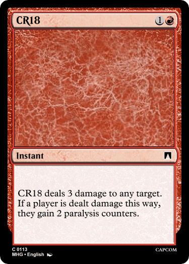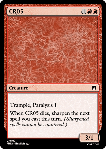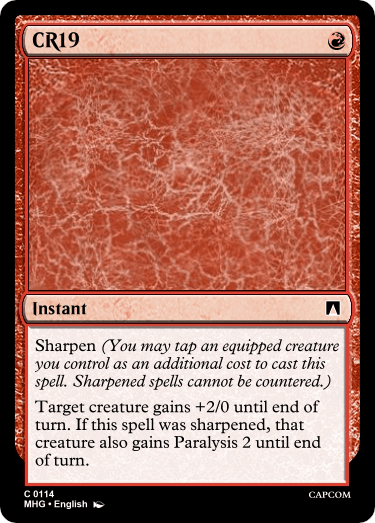 Still, my main focus with red was lots and lots of the Sharpen mechanic to be able to build a good foundation for the Red/Blue archetype of the set, as well as Paralysis for the Red/Black archetype. There are a couple novel designs laying around in here somewhere, and I’m sure after some reworks/redesigns it’ll be a serviceable set of commons.